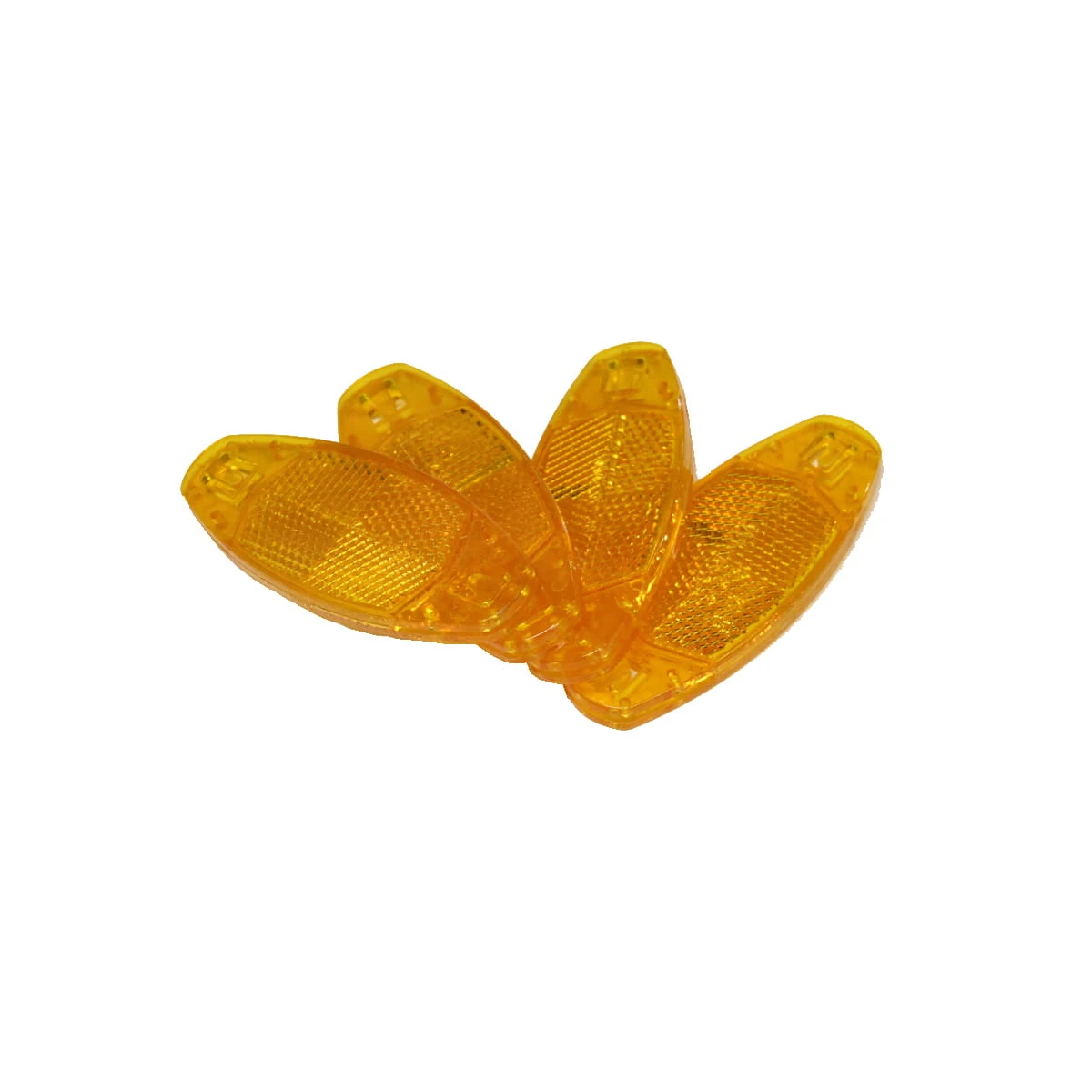 Handelsübliche StVZO zugelassene Speichenreflektoren / Katzenaugen zum “Einklicken“ an die Speichen. Mit Sicherungsverschluss, damit diese besser an den Speichen klemmen und nicht verloren gehen.
